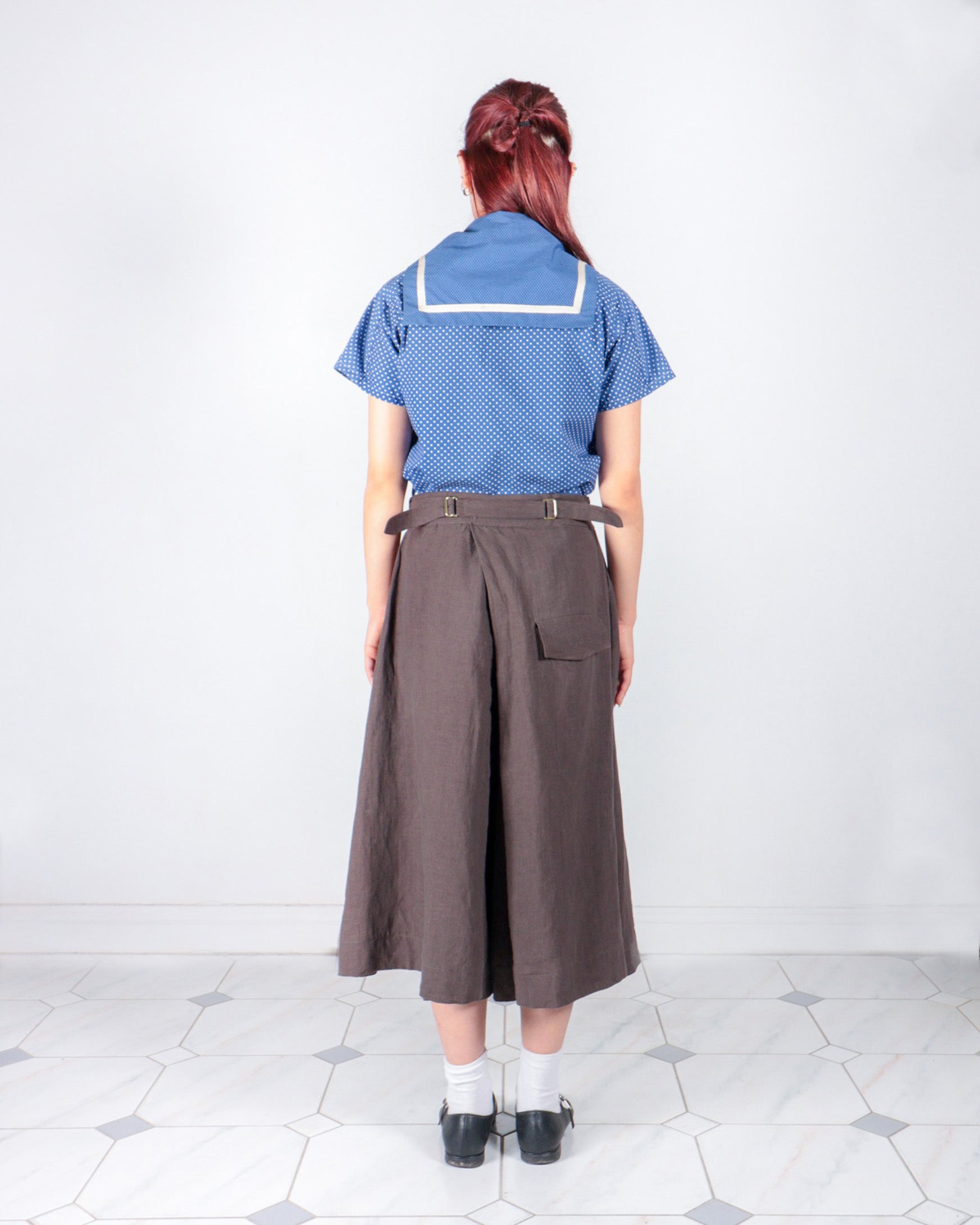 Wide pleated Trouser with apron attached. Inner waistband button with fly closure. Crossover pleat and back waistband straps accommodate different waist hip ratio.