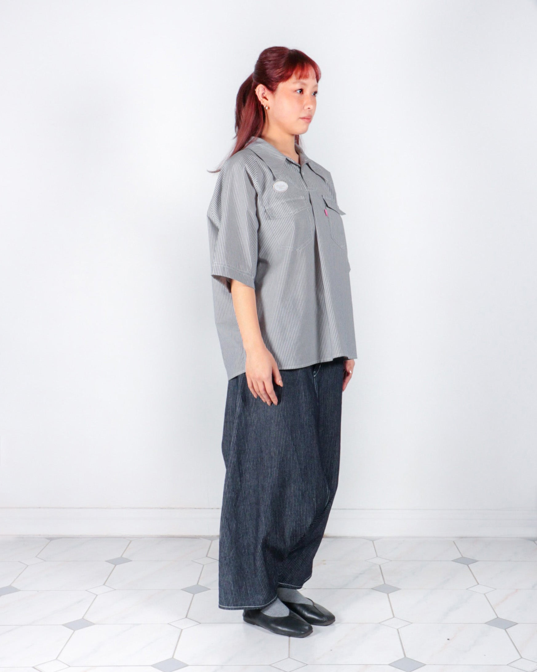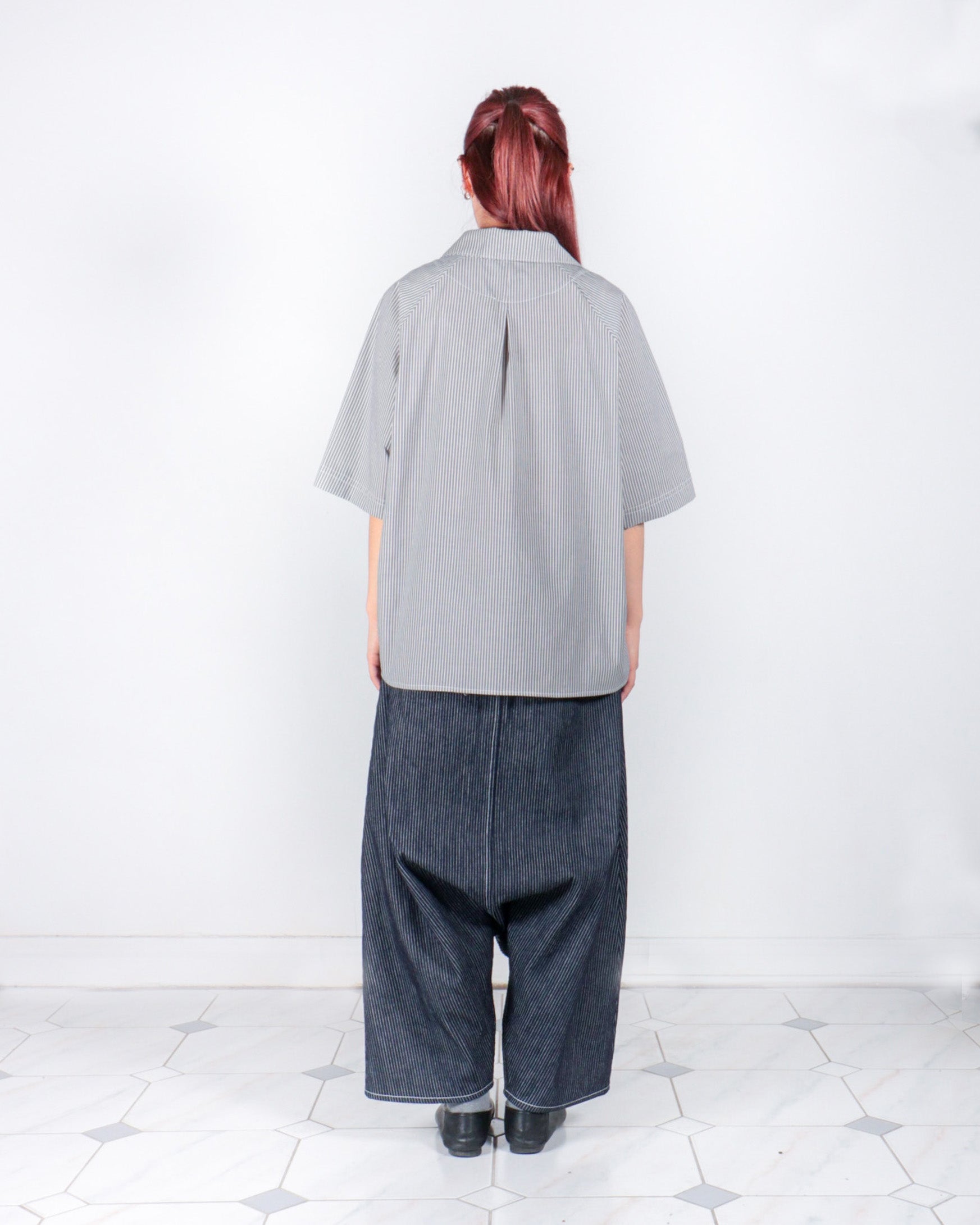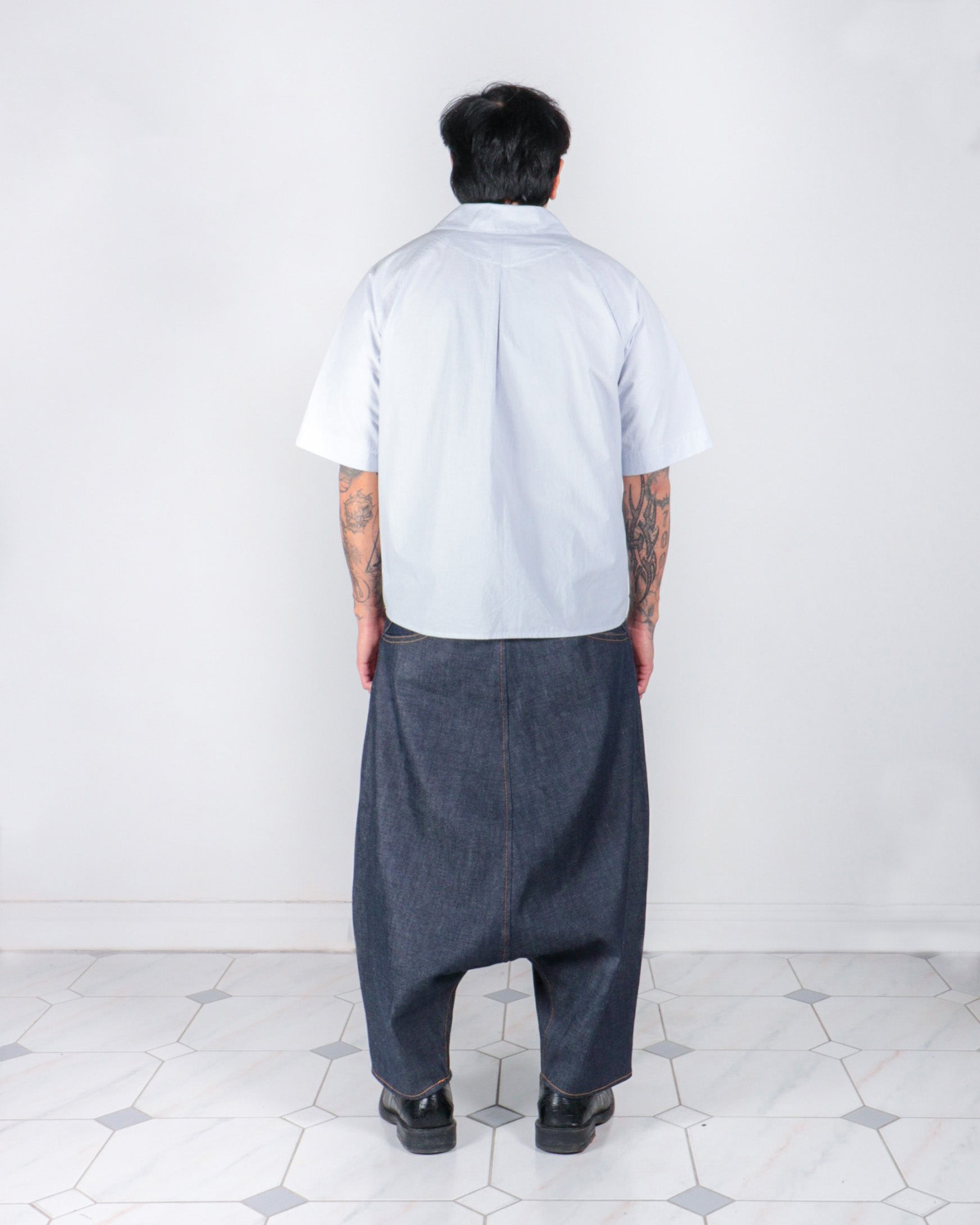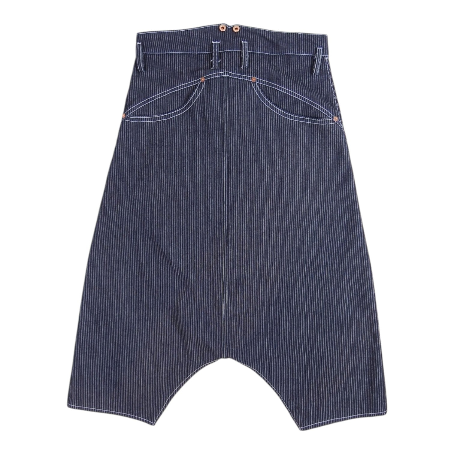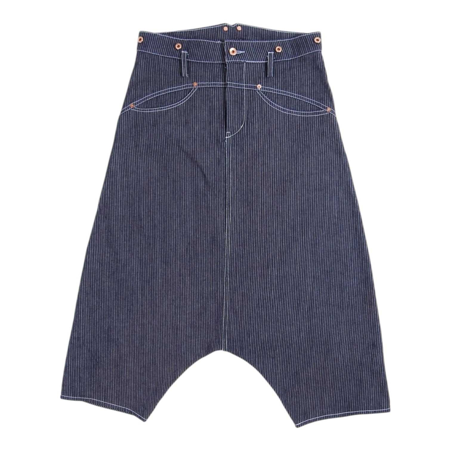 Drop crotch denim with contrast stitching. front and back jeans set into the yoke of the trouser. lowered belt loops and curved waistband is designed to be worn either with a belt, or with button-fixed suspenders.This product is a pre-order and will be delivered late May to early June